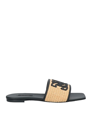 slide sandals, raffia, leather, two-tone, no appliqués, leather lining, square toe, flat, leather/rubber sole, contains non-textile parts of animal origin