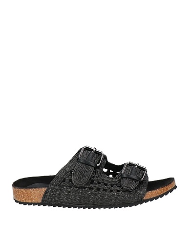sandals, raffia, solid color, no appliqués, leather lining, buckle fastening, round toe, flat, rubber sole, contains non-textile parts of animal origin