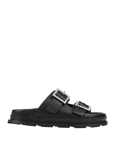 sandals, pebbled-leather, solid color with appliqués, crystals, leather lining, round toe, flat, rubber cleated sole, contains non-textile parts of animal origin