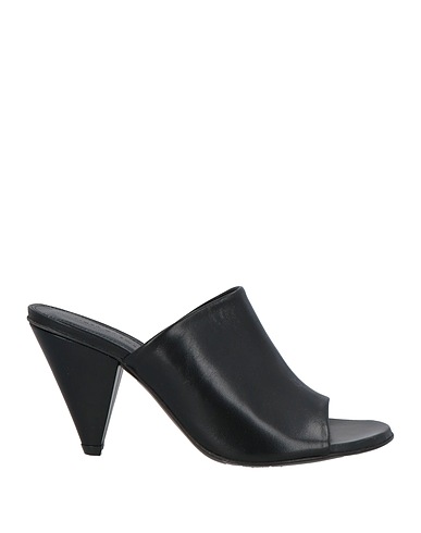 slide sandals, leather, solid color, no appliqués, leather lining, round toe, cone heel, leather sole, contains non-textile parts of animal origin