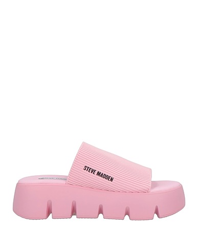slide sandals, knitted, ribbed, solid color, brand logo, fully lined, round toe, flat, rubber sole