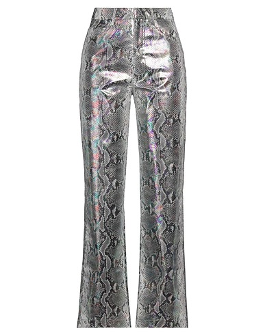 coated fabric, snakeskin print, laminated effect, no appliqués, multicolor pattern, high waisted, straight leg, regular fit, zipper closure, hook-and-eye closure, multipockets, pants