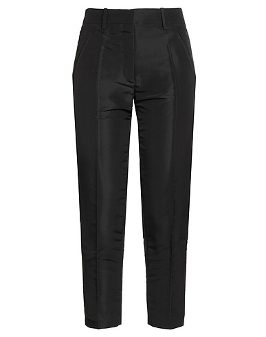 tapered pants, taffeta, solid color, no appliqués, mid rise, belt loops, regular fit, hook fastenings, zipper fastening, slit pockets, welt pocket, dry clean, do not bleach, do not tumble dry, cropped