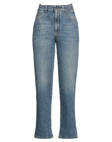 denim, metal applications, solid color, medium wash, high waisted, belt loops, straight leg, regular fit, 1 button, zipper closure, five pockets, straight-leg model