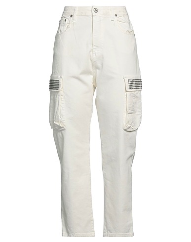 denim, worn effect, brand logo, metal applications, solid color with appliqués, colored wash, high waisted, belt loops, straight leg, regular fit, zipper closure, 1 button, multipockets, stretch, straight-leg model