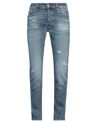denim, faded, torn fabric, brand logo, solid color, medium wash, mid rise, drawstring waist, straight leg, regular fit, button closing, five pockets, stretch, straight-leg model