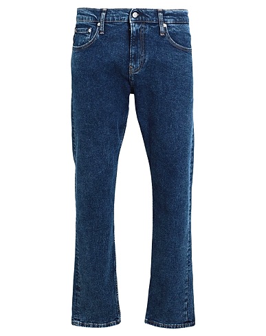 denim, brand logo, solid color, dark wash, mid rise, straight leg, slim-leg pants, 1 button, zipper closure, five pockets, skinny model