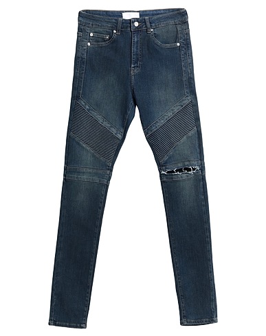 denim, faded, brand logo, solid color, medium wash, mid rise, tapered leg, slim-leg pants, zipper closure, 1 button, five pockets, stretch, skinny model