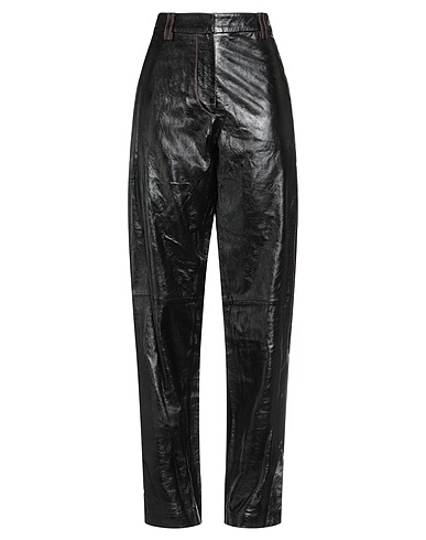 straight-leg pants, leather, solid color, no appliqués, high waisted, regular fit, zipper fastening, hook fastenings, slit pockets, patch pockets, do not wash, do not bleach, do not tumble dry, do not iron, contains non-textile parts of animal origin