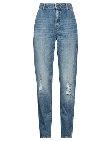 denim, faded, distressed, brand logo, solid color, medium wash, high waisted, zipper fastening, 1 button, multipockets, tapered model