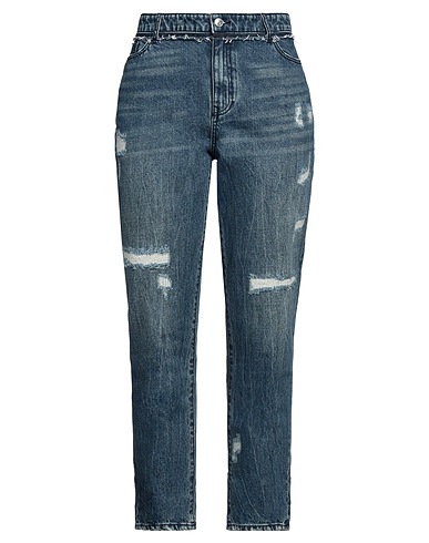 denim, faded, distressed, brand logo, solid color, medium wash, high waisted, regular fit, button fastenings, zipper fastening, multipockets, boyfriend model