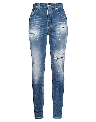 denim, distressed, faded, brand logo, solid color, medium wash, high waisted, belt loops, slim fit, 1 button, zipper fastening, zips at hem, multipockets, stretch, machine wash or dry clean, do not bleach, do not tumble dry, contains non-textile parts of animal origin, tapered jeans