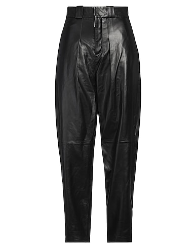 leather, no appliqués, solid color, high waisted, regular fit, zipper fastening, hook fastenings, multipockets, do not wash, do not bleach, do not tumble dry, do not iron, contains non-textile parts of animal origin, straight-leg pants