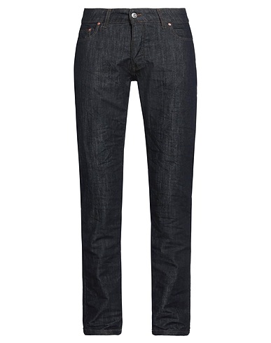 tapered jeans, denim, stretchy fabric, solid color, no appliqués, dark wash, low waisted, elasticized waist, slim fit, button fastenings, pockets, dry clean, do not bleach, do not tumble dry