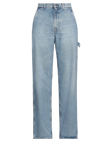 straight-leg jeans, denim, faded, solid color, brand logo, medium wash, high waisted, belt loops, regular fit, zipper fastening, 1 button, pockets, dry clean, do not bleach, do not tumble dry