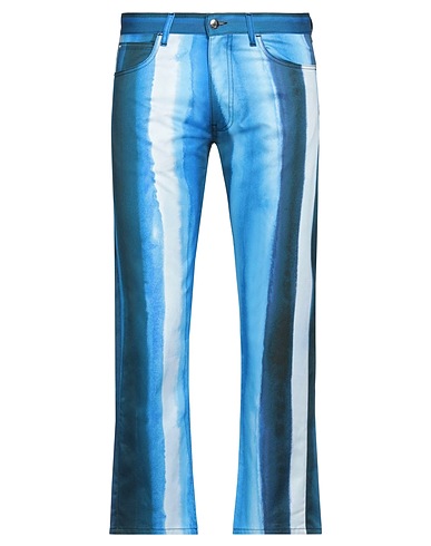 tapered jeans, denim, tie-dyed, striped, brand logo, colored wash, mid rise, belt loops, slim fit, 1 button, zipper fastening, five pockets, hand wash or dry clean, do not bleach, do not tumble dry, contains non-textile parts of animal origin, this brand runs large, cropped