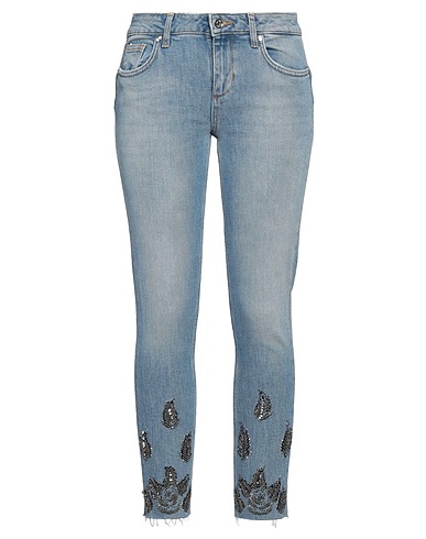 tapered jeans, denim, faded, solid color with appliqués, beads, sequins, medium wash, mid rise, slim fit, zipper fastening, 1 button, raw-cut hem, pockets, machine wash, do not bleach, do not tumble dry