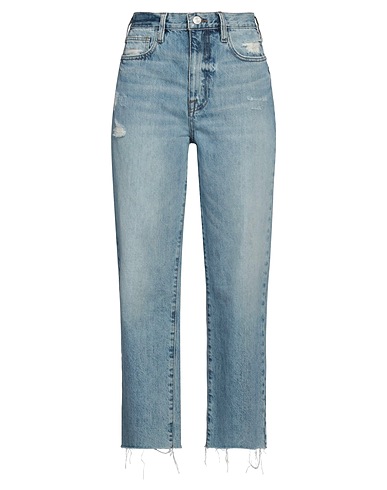 straight-leg jeans, denim, faded, distressed, solid color, no appliqués, light wash, high waisted, regular fit, zipper fastening, button fastenings, fringed hem, multipockets, machine wash or dry clean, do not bleach, tumble dry