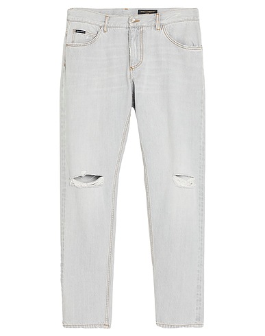 tapered jeans, denim, distressed, solid color, brand logo, leather trims, colored wash, high waisted, regular fit, zipper fastening, 1 button, five pockets, dry clean, do not bleach, do not tumble dry, contains non-textile parts of animal origin