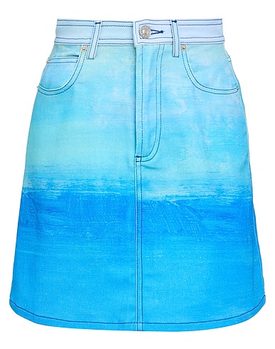 flared skirt, denim, tie-dyed, brand logo, leather trims, colored wash, regular fit, zipper fastening, 1 button, multipockets, stretch, machine wash or dry clean, do not bleach, do not tumble dry, contains non-textile parts of animal origin, this brand runs large