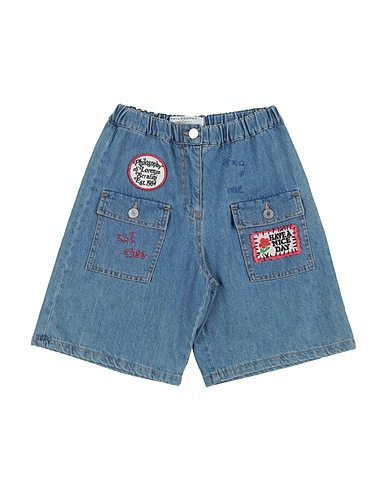 denim, solid color with appliqués, brand logo, embellished, medium wash, elasticized waist, zipper fastening, 1 button, machine wash, do not bleach, do not tumble dry