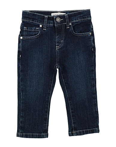 denim, stretchy fabric, solid color, brand logo, dark wash, zipper fastening, 1 button, five pockets, machine wash or dry clean, do not bleach, tumble dry