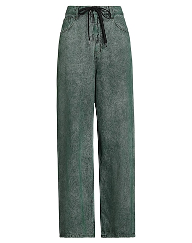 wide-leg jeans, denim, distressed, solid color, brand logo, colored wash, low-crotch, drawstring waist, relaxed fit, zipper fastening, button fastenings, multipockets, machine wash or dry clean, do not bleach, do not tumble dry