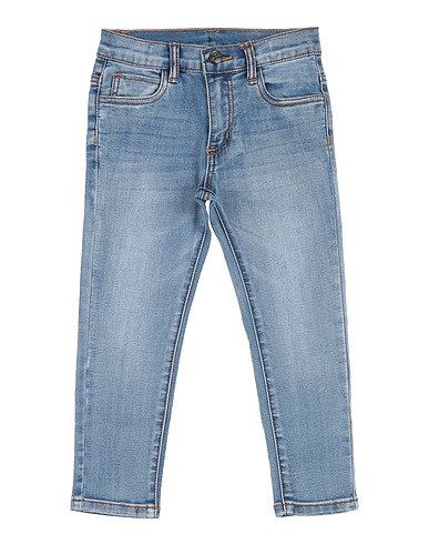 denim, stretchy fabric, solid color, embroidered logo, medium wash, belt loops, zipper fastening, five pockets, machine wash, do not bleach, do not tumble dry