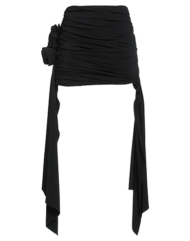 flared skirt, crepe, solid color, draped, floral appliqués, elasticized waist, stretch, dry clean, do not bleach, do not tumble dry