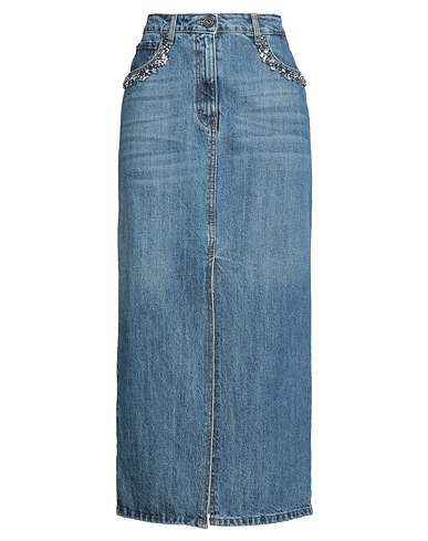 pencil skirt, denim, faded, solid color, brand logo, crystals, medium wash, unlined, zipper fastening, button fastenings, multipockets, machine wash, do not bleach, tumble dry
