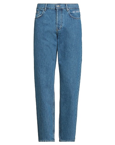 straight-leg jeans, denim, solid color, embroidered logo, medium wash, high waisted, belt loops, regular fit, button fastenings, five pockets, machine wash, do not bleach, do not tumble dry, this brand runs small