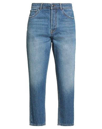 tapered jeans, denim, faded, solid color, embroidered logo, medium wash, high waisted, regular fit, concealed button fastenings, five pockets, machine wash or dry clean, do not bleach, do not tumble dry, cropped