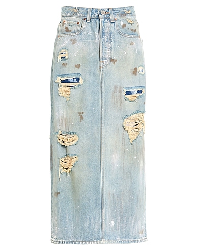 flared skirt, denim, faded, distressed, solid color, no appliqués, light wash, regular fit, unlined, button fastenings, multipockets, machine wash, do not bleach, do not tumble dry