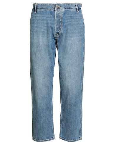 straight-leg jeans, denim, faded, stretchy fabric, solid color, brand logo, medium wash, mid rise, belt loops, regular fit, button fastenings, slit pockets, machine wash, do not bleach, tumble dry, cropped