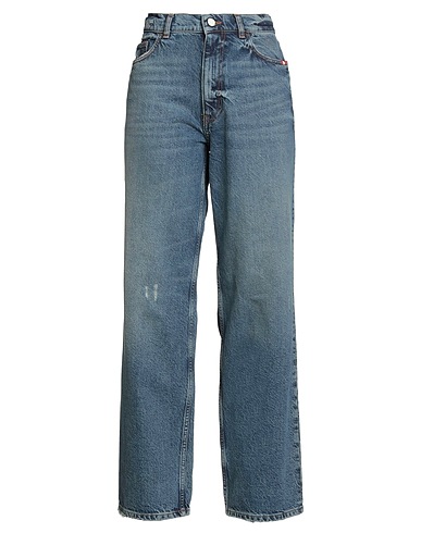straight-leg jeans, denim, distressed, faded, solid color, brand logo, medium wash, high waisted, belt loops, regular fit, zipper fastening, 1 button, multipockets, machine wash, do not bleach, do not tumble dry