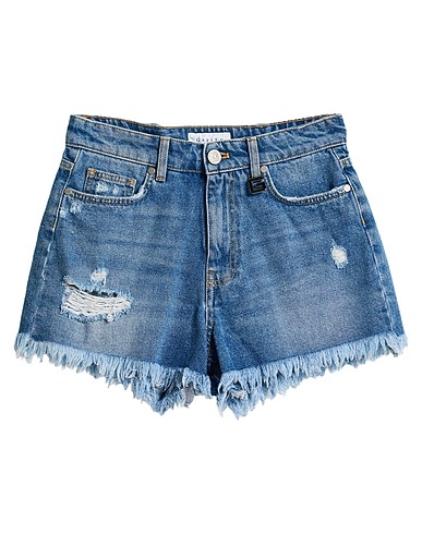 hot pants, denim, distressed, faded, solid color, brand logo, medium wash, high waisted, regular fit, zipper fastening, fringed hem, five pockets, machine wash or dry clean, do not bleach, tumble dry, planning a weekend getaway or beach vacation? this is the effortless summer style you need