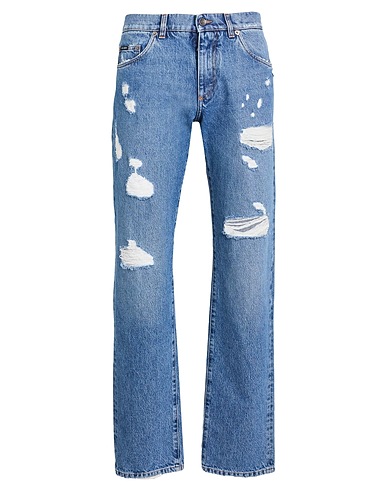 straight-leg jeans, denim, distressed, solid color with appliqués, embroidered logo, medium wash, mid rise, belt loops, regular fit, zipper fastening, 1 button, multipockets, machine wash or dry clean, do not bleach, do not tumble dry