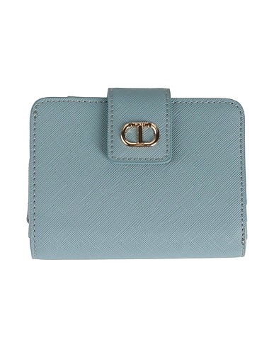 wallet, synthetic material, solid color, brand logo, internal compartments, snap fastenings, external pocket with zip