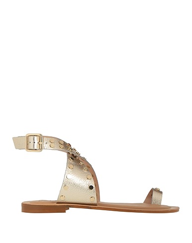 toe strap sandals, pebbled-leather, metallic, solid color with appliqués, studs, leather lining, buckle-fastening ankle strap, round toe, flat, rubber sole, contains non-textile parts of animal origin