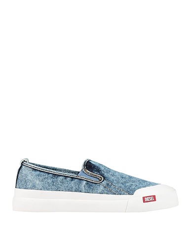 slip on, denim, solid color, brand logo, fabric inner, elasticized inserts, round toe, rubber cleated sole