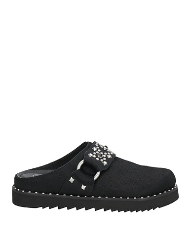 mules, calf hair, solid color with appliqués, studs, leather lining, round toe, flat, rubber cleated sole, contains non-textile parts of animal origin