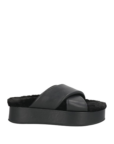 sandals, leather, no appliqués, solid color, plush fabric inner, round toe, flatform, rubber sole, contains non-textile parts of animal origin