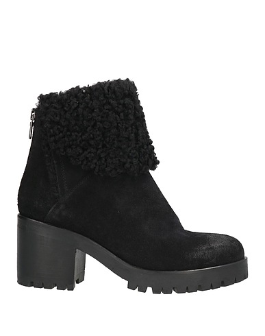 padded ankle boots, suede, solid color with appliqués, sherpa trims, plush fabric inner, zipper fastening, round toe, square heel, lug sole, contains non-textile parts of animal origin