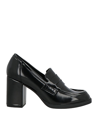 penny loafers, glossed-leather, no appliqués, solid color, leather lining, round toe, square heel, rubber cleated sole, contains non-textile parts of animal origin