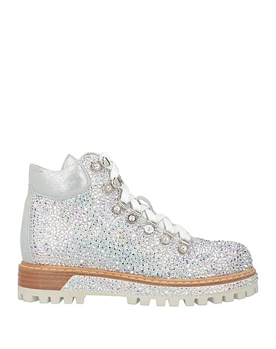 hiking boots, leather, metallic, solid color with appliqués, crystals, leather lining, lace-up, round toe, wedge heel, rubber cleated sole, contains non-textile parts of animal origin