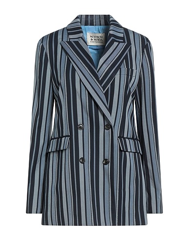 double-breasted blazer, twill, striped, no appliqués, lapel collar, long sleeves, fully lined, button fastenings, flap pockets, rear slit, stretch, dry clean, do not tumble dry