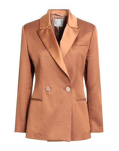 double-breasted blazer, woven, satin, solid color, no appliqués, lapel collar, long sleeves, fully lined, button fastenings, welt pockets, rear slit, dry clean, do not bleach, do not tumble dry