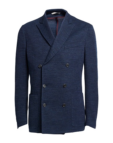 double-breasted blazer, knitted, lightweight knit, mélange, no appliqués, lapel collar, long sleeves, partially lined, button fastenings, patch pockets, dual back vents, dry clean, do not bleach, do not tumble dry