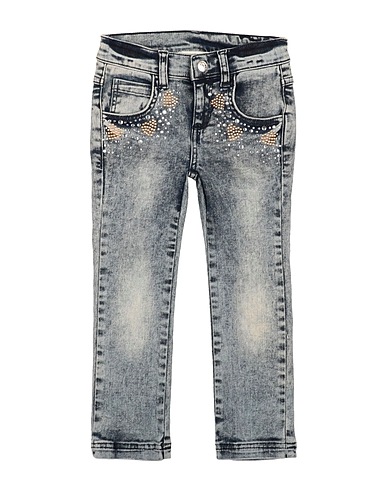 denim, crystals, brand logo, solid color with appliqués, light wash, button fastenings, zipper fastening, multipockets, stretch, hand wash, do not tumble dry, do not bleach, straight-leg model