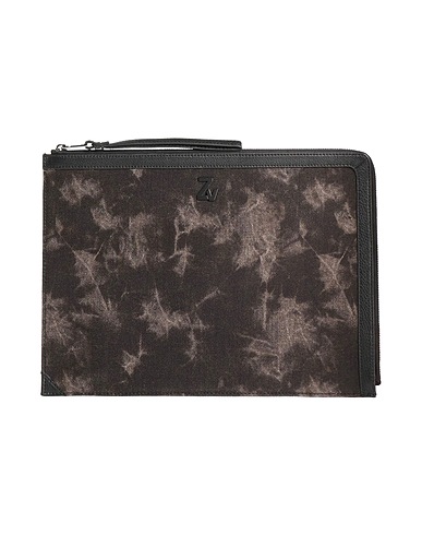 document case, denim, tie-dyed, brand logo, leather trims, zipper fastening, bag handle, large size, contains non-textile parts of animal origin